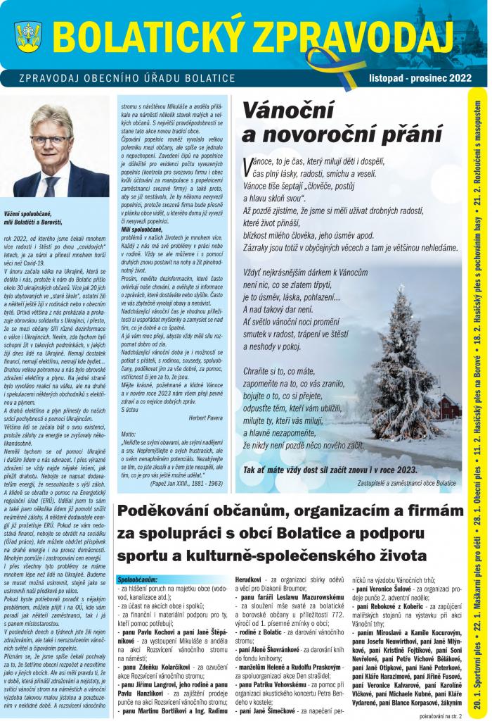 Z obsahu: Vánoční a novoroční přání, Volby prezidenta 2023, stavba DSS, rozpočet obce na rok 2023, obecní stavby, poděkování občanům a firmám a další zprávy spolků a organizací...