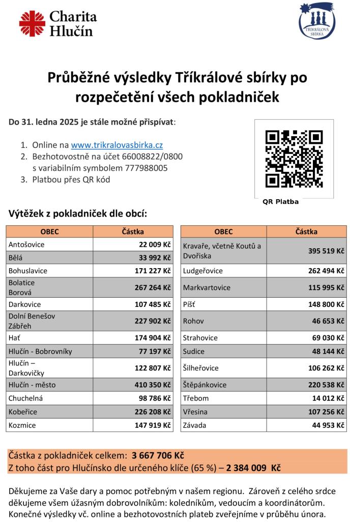 Průběžné výsledky Tříkrálové sbírky po rozpečetění všech pokladniček