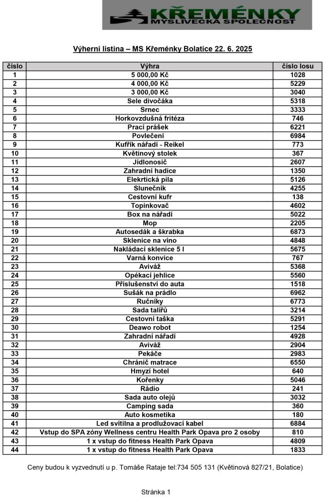 Výherní listina tomboly MS Křeménky 22.6.2025