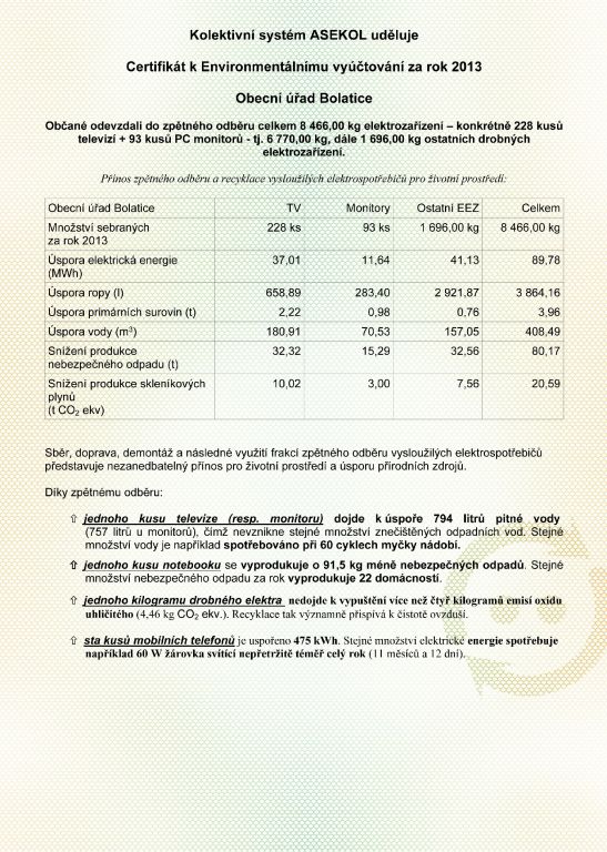 „Z Certifikátu Environmentálního vyúčtování společnosti ASEKOL vyplývá, že občané naší obce v loňském roce vytřídili 228 televizí, 93 monitorů a 1 696,00 kg drobných spotřebičů. Tím jsme uspořili 89,78 MWh elektřiny, 3 864,16 litrů ropy, 408,49 m3 vody a 3,96 tun primárních surovin. Navíc jsme snížili emise skleníkových plynů o 20,59 tun CO2 ekv., a produkci nebezpečných odpadů o 80,17 tun“.