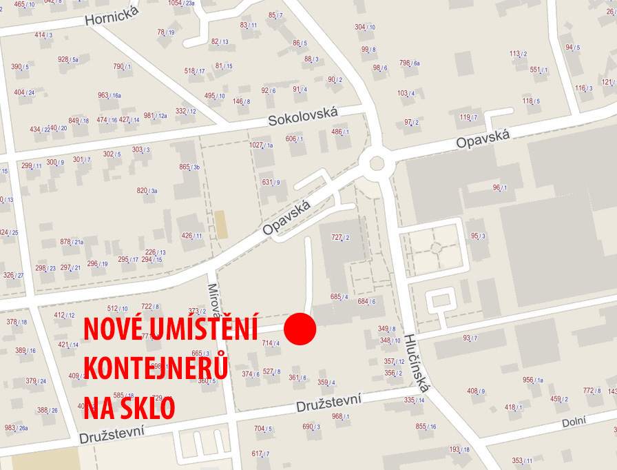 kontejnery na tříděné sklo byly přemístěny z prostoru před obchodním střediskem TEMPO na nové místo! Nově jsou umístěny na ploše za starou kotelnou OÚ (vedle boxu Zásilkovny na ul. Mírová). Zde budou tyto kontejnery umístěny již natrvalo.