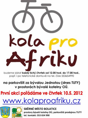 „Jsou na světě místa, kterým se můžeš přiblížit jen pěšky nebo na kole. V Africe jsou pro děti obtížně dostupné i školy. Darováním opotřebovaného jízdního kola můžeš i Ty změnit život dítěte v Africe.“